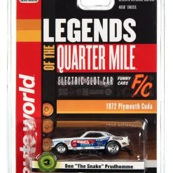 This is the LEGENDS OF THE QUARTER MILE Auto World 1972 Plymouth Cuda Funny Car (White w/Flames) Don ” The Snake” Prudhomme Snake II 4Gear HO Slot Car