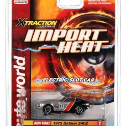 This is the IMPORT HEAT Auto World 1973 Datsun 24OZ (Silver/Red/Black) Import Heat X-Traction HO Slot Car