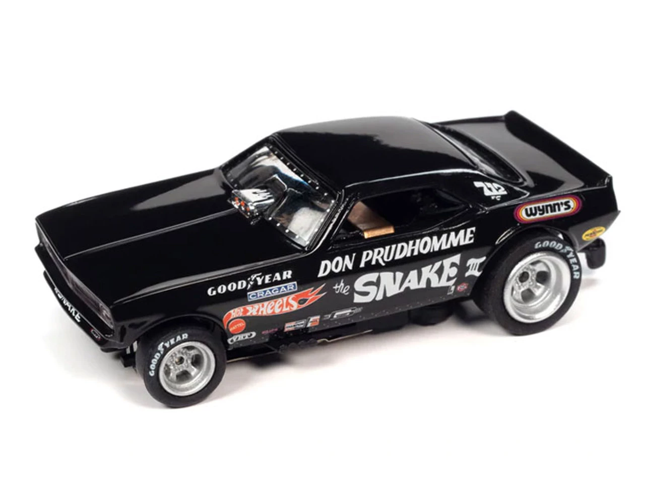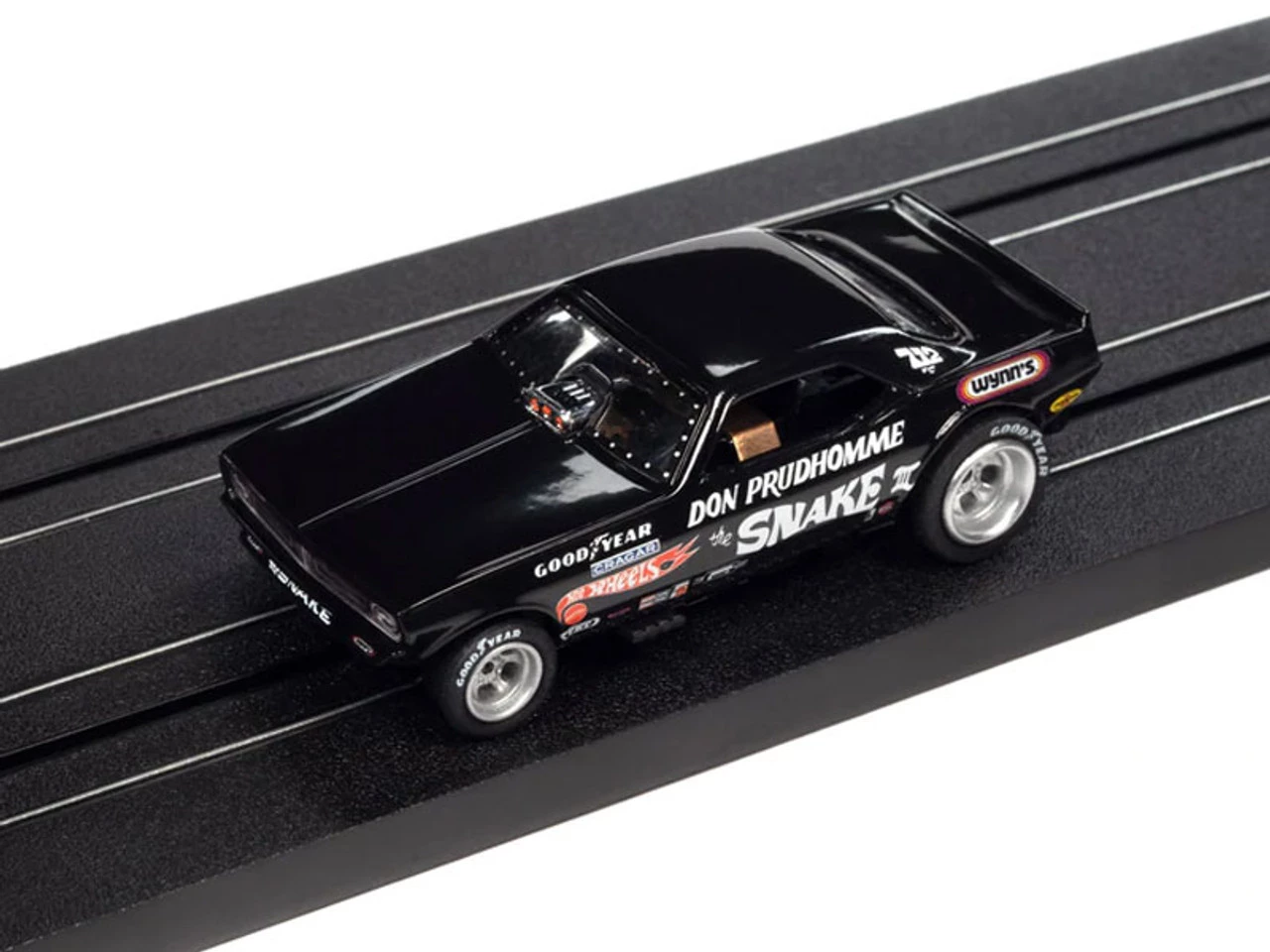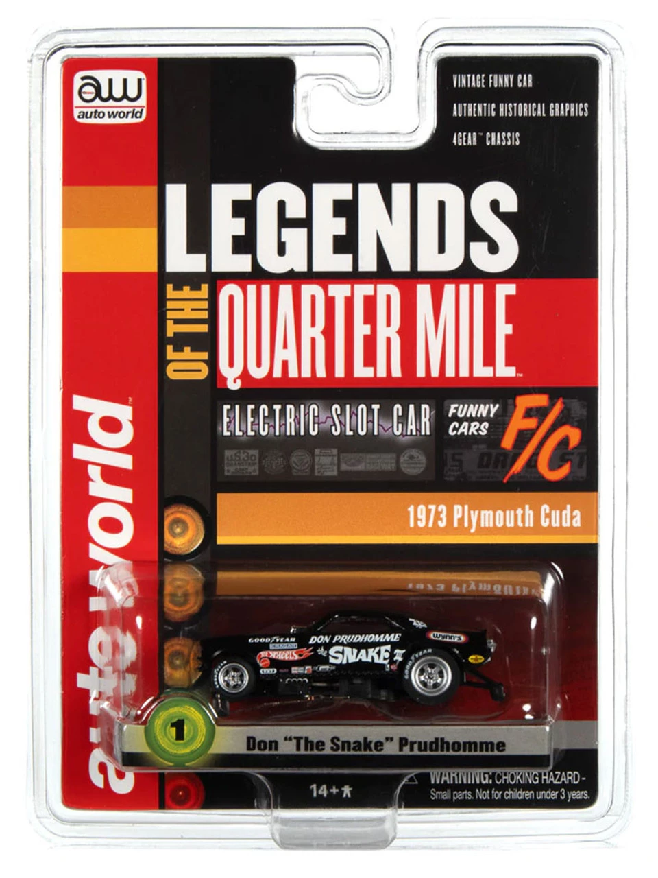 This is the LEGENDS OF THE QUARTER MILE Auto World 1973 Plymouth Cuda Funny Car (Black) Don “The Snake” Prudhomme 4Gear Legends HO Slot Car
