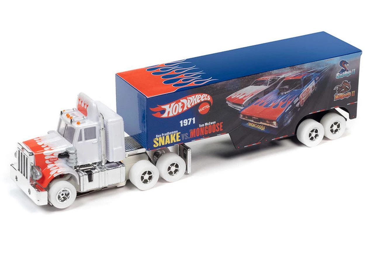 This is the Auto World iWHEELS Racing Rig Peterbilt Model 359 w/Race Trailer (Snake II vs. Mongoose II) Xtraction Flamethrowers R12 HO Slot Car