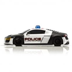 This is the Scalextric Audi R8 HH Police Car Black & White 1/32 Analog Slot Car. While not your average police car, the Audi R8 is surely something not many criminals would be able to escape from! This Scalextric version comes complete with both a siren and flashing police lights on the roof.